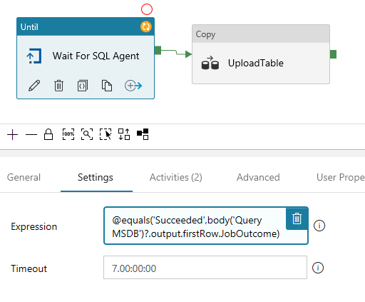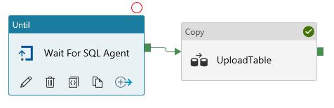 Now the fun part… Let’s add an Until activity so we can handle the remaining requirements in the scenario above, waiting for some local SQL Agent job to complete before loading the data into Azure.