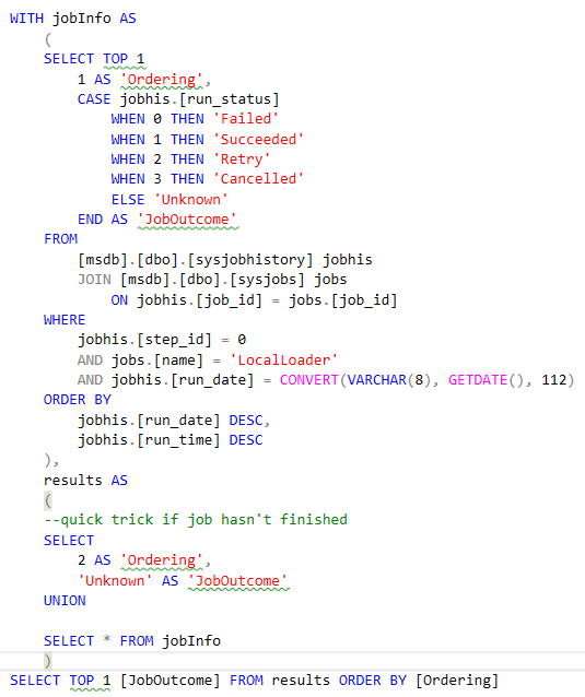 Note; the TSQL query returns the field ‘JobOutcome’