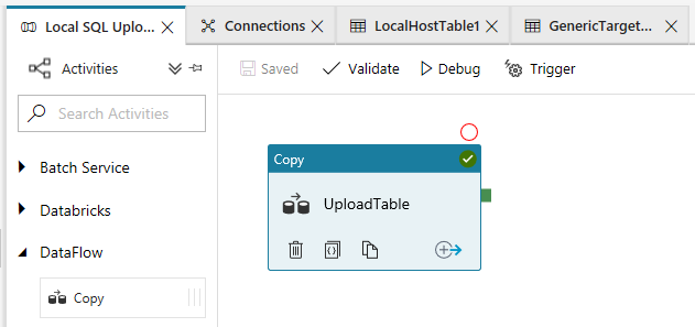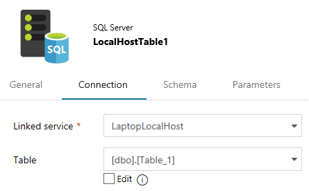 - The source dataset is a table from my local SQL Server instance via a hosted IR and linked service.