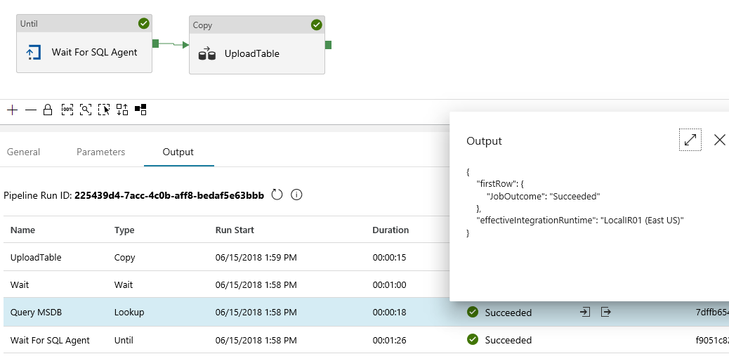 The TSQL query will return ‘Succeeded’ or ‘Unknown’. We therefore need to compare the returned value using the ADF expression function ‘equals’ and to capture the Lookup output we need to use the undocumented ADF expression function ‘body’.
