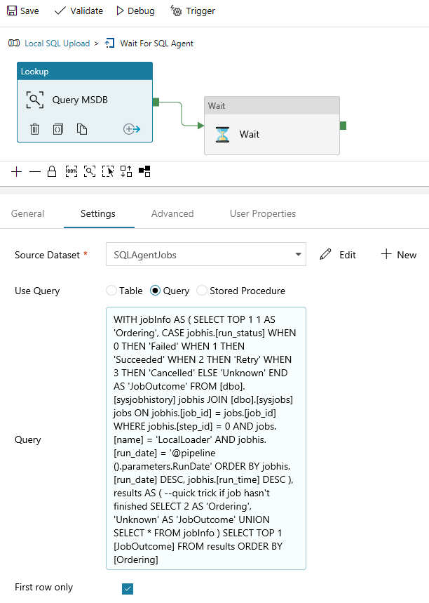 To check the status of this job I’ve written a quick TSQL query using todays date to return the jobs status last time it ran. I’m using the job history table from MSDB so I’m cheating and not detecting if the job is running or not started, but instead I’ve added a union in the results to a static value. Mainly because I always want something returned to ADF. No tolls please, I accept this query isn’t perfect given the other MSDB tables available. There are plenty of better agent job check queries out there. The point of this post is about the ADF Until activity… I’ll make the query small so you can’t read it without enlarging 🙂 it’ll do for this example.