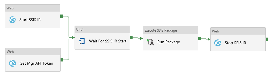 - An ADFv2 Until activity that waits for the Runbook job is complete, checking its status with each iteration. Affectively polling for when the SSIS IR has started.