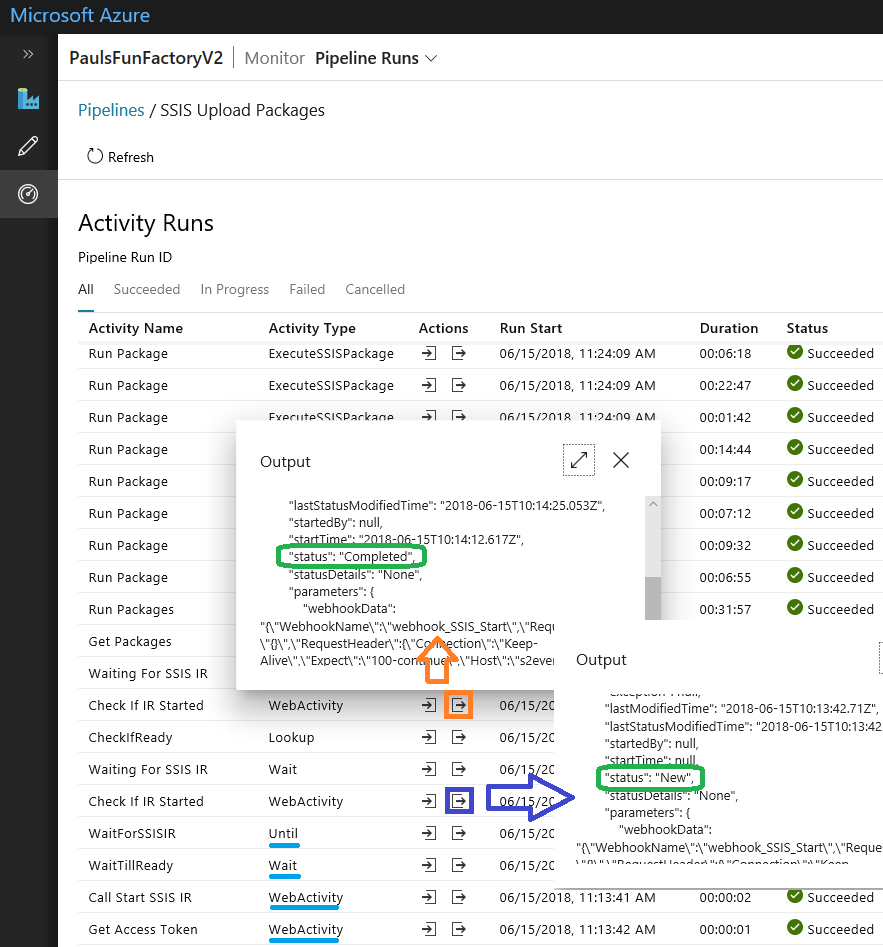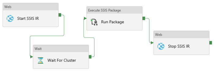 However, the problem and the reason for the Wait activity in the basic approach is because the ADF Web activity calls are asynchronous. The Azure Automation runbooks are then called, compute allocated (queued) and then executed. We therefore have a disconnection between hitting the Web Hook and the PowerShell, this means the ADF pipeline could continue and try to run the package(s) before the SSIR IR cluster has actually come up. If that happens the packages will fail.