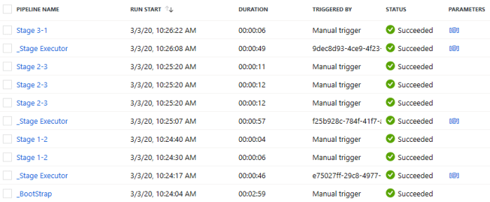 For the end to end run of the framework we have a few options to see progress once its been triggered. Before that its worth pointing out that in the below I’ve used the sample metadata provided with the database scripts in GitHub. Then for each execution pipeline I’ve added a single Wait activity with a random time delay of a few seconds. The point here is to test the framework execution, not the pipelines being called. To further clarify, the Stage X-X pipelines names should be replaced with your actual pipeline names in your data platform solution.