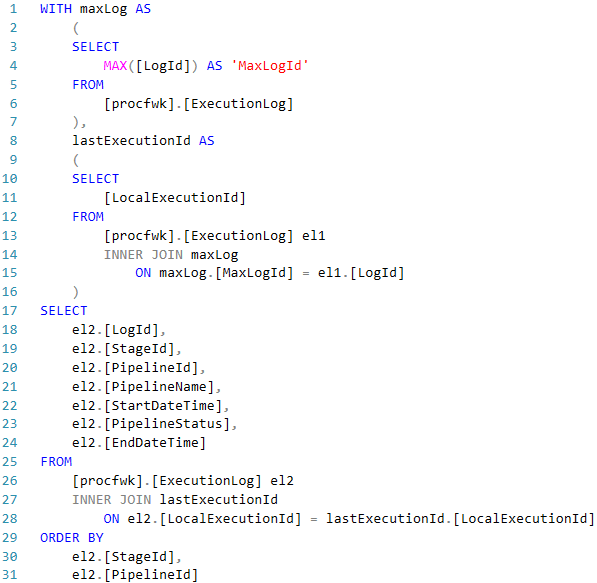 [procfwk].[CurrentExecution]is copied to the long term log table[procfwk].[ExecutionLog]and the current execution table truncated. If your pipeline(s) complete very quickly this data may get archived off before you’ve queried the current run table. This can lead to me/you thinking that nothing happened the first time and getting very confused because Data Factory shows it did execute! If you have any doubts, just use the following query to ensure you return details of the last execution.