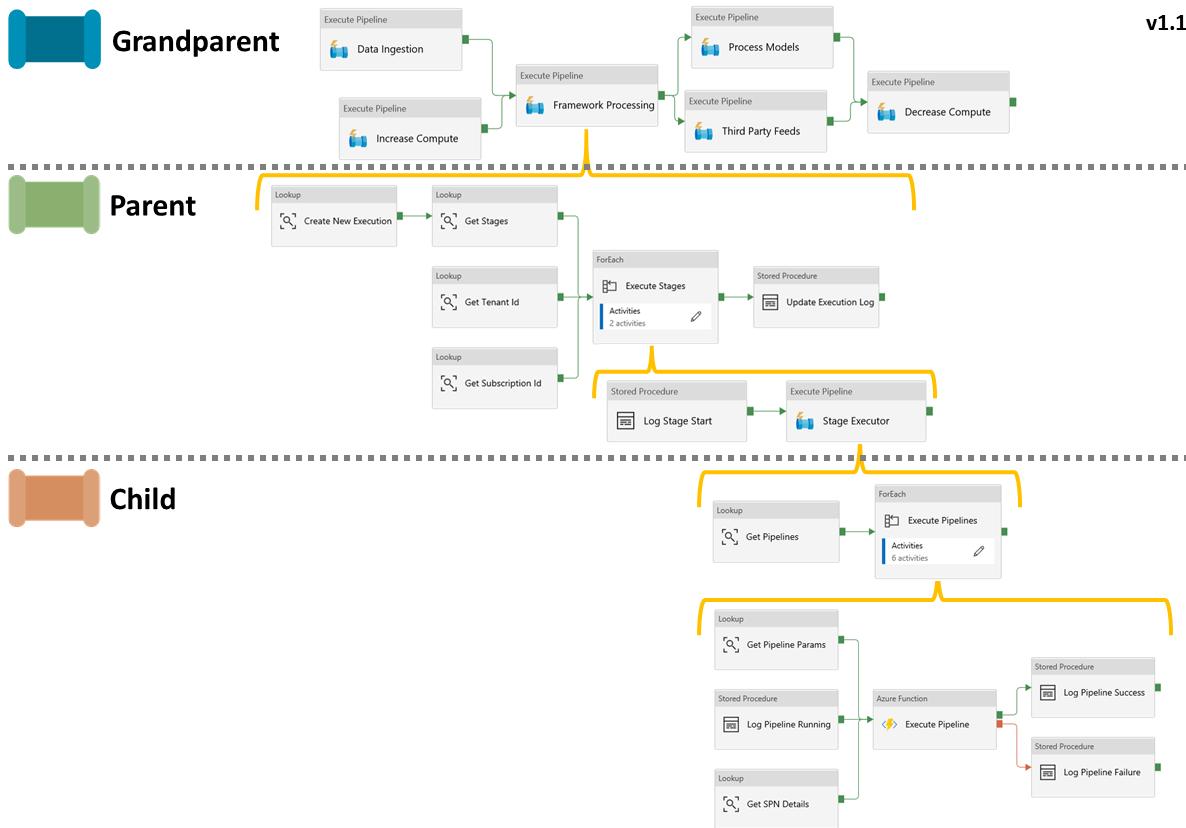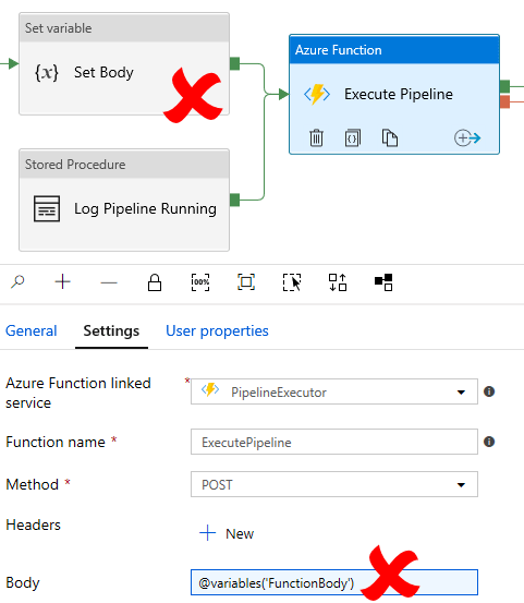 By accident, doing this release meant fixing a bug in v1.0 of the processing framework (sorry) where the Azure Function body was being created using a variable within the child pipeline. This variable was set for each of the pipelines being called before passing the resulting concatenated body (as a variable) to the Azure Function. Unfortunately, variables are scoped at the child pipeline level, meaning the parallel execution of the second level ForEach activity was not “thread safe” when it came to setting/creating the new variable strings for each pipeline being called. This was certainly a miss placed assumption I had about the scope of pipeline variables. Please watch out for this if using v1.0 and refactor the ‘Set Body’ activity as a priority. Workaround below.