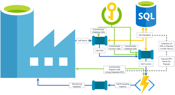 - At runtime Data Factory will be authenticated to access the SQLDB with its existing Linked Service connection (backed by Azure Key Vault). This connection and credential will use a special database ROLE that I’ve called