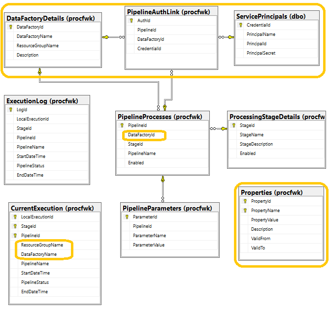 [procfwk].[DataFactoryDetails]– extends the existing metadata to the next level allowing many pipelines to be joined to a Data Factory and Resource Group record.[procfwk].[PipelineProcesses]– updated to support the new relationship to the Data Factory metadata table.[dbo].[ServicePrincipal]– added to house encrypted service principal details in an isolated schema to all other metadata.[procfwk].[PipelineAuthLink]– allows a many to many relationship between Service Principal’s, Data Factory’s and Pipelines.[procfwk].[Properties]– houses global properties for the framework and supporting slowing change behaviour for property values.[procfwk].[CurrentExecution]– updated with new attributes for Data Factory name and Resource Group name.