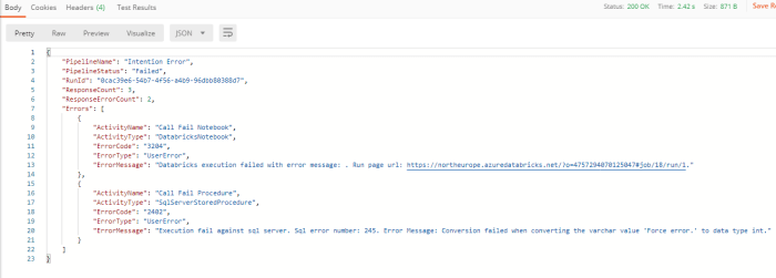 The main thing to consider is how these error details are reported programmatically, via C# in my case, from the ADF Pipeline run. The main class used is called ‘Query By Pipeline Run‘ which in the .NET SDK is available via the DataFactoryManagementClient. This query response contains details of everything about the pipeline run and all executed Activities; success or fail. Therefore exacting the error message information can be a little tricky when presented with a huge response body for every Activity. This is my motivation for wanting to simplify things into a targeted Azure Function call. Furthermore, given my Pipeline structure above an array is required if we need to deal with multiple Activities responses.
