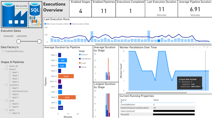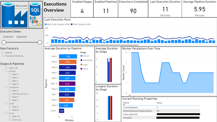 Firstly, to create something meaningful to report on I left the framework running in my test environment for about a week being triggered every 2 hours by a separate caller Data Factory. I also used a stored procedure to randomly set the Worker pipeline Wait activities to different durations to give some variety to the metrics. You can see in the dashboard I racked up 90 executions of framework with only a handful of intentional failures to capture restarts in the reporting. If nothing else I hope this demonstrates a good amount of resilience in the framework boiler plate code.