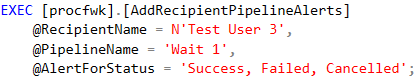 [procfwk].[AddRecipientPipelineAlerts]– Assuming a recipient email address record has already been added this procedure creates the alert link between the recipient record and the Worker pipeline(s). Default parameters can be used to add the link for either a specific pipeline or all pipelines. Then either all pipeline status values or just a subset. A comma separated string can be used to translate the named values into the correct bitmask value. Example below: