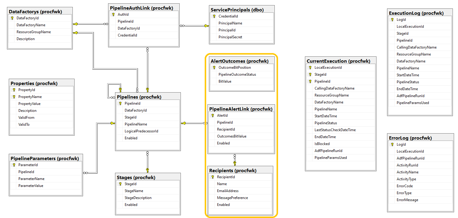 To support the new email alerting capabilities several database changes have been made. The main reasons for this was to absorb as much work as possible into the metadata database without needing to burden Data Factory with lots of additional steps in the framework core pipelines (Grandparent > Infant).