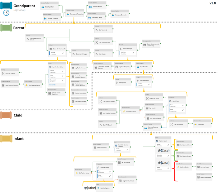 The main Data Factory change is the introduction of the clean up Activities within the parent level. This logic is explained fully below the image.