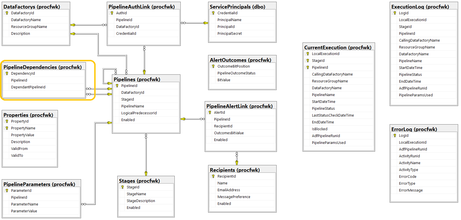 The updates in this release relating to better pipeline dependency handling and the restart clean up process mean a lot of stored procedure changes. But only one new table added to the database ([procfwk].[PipelineDependencies]). An updated database diagram is shown below.