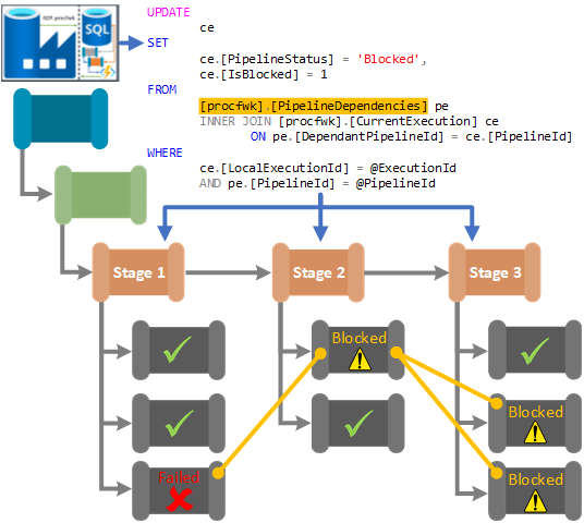 DependencyChain = The pipeline status is updated to ‘Failed’ in the [procfwk].[CurrentExecution] table. Then only downstream pipelines are marked as blocked (using the [DependantPipelineId] attribute in the new [procfwk].[PipelineDependencies] table). Once done, processing is then allowed to continue. When the next execution stage starts only pipelines not blocked will get a status of ‘Preparing’ and be allowed to run. Finally, the stored procedure [procfwk].[CheckForBlockedPipelines] will look ahead to the next execution stage and mark any further downstream dependant pipelines as ‘Blocked’, continuing the chain.