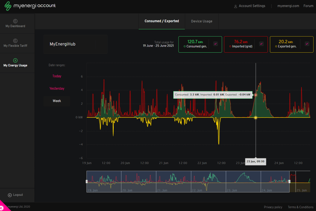The same charts can be explored in more detail via the MyEnergi website and user account portal. If looking at data and charts is your thing. Shown below.