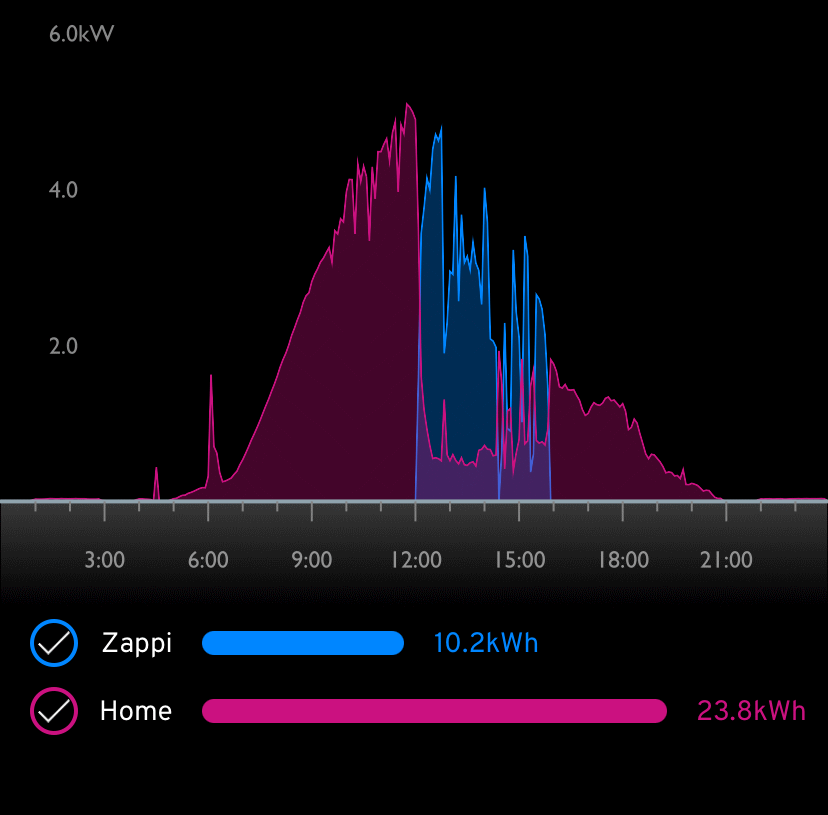 This is all done automatically and constantly adjusted so you avoid importing energy from the national grid during charging. If there isn’t any excess energy, the charger will simply pause and wait.