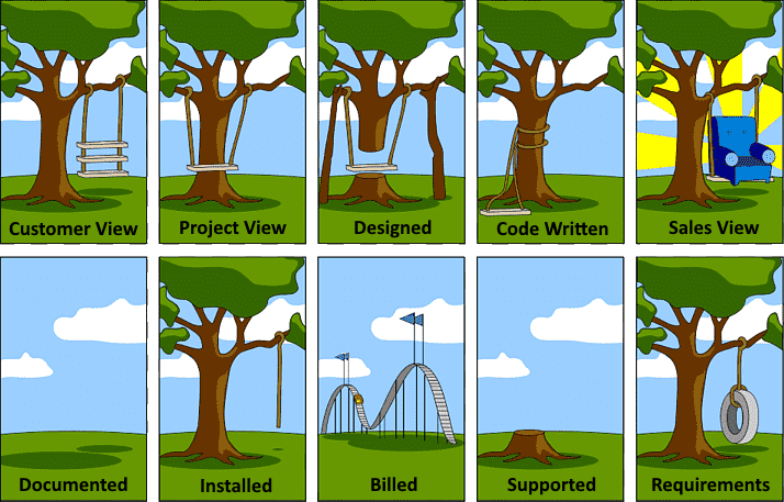 Capturing what, why and how in a delivery teams backlog following a well-designed solution is the most important part of a successful project. Because ultimately, if the detail and definition is missing from the backlog how can anyone realistically deliver what is required in a scalable way. For me, the following popular image comes to mind and gives an amusing, but worryingly realistic perspective on what can happen when design turns into delivery. Without clear business requirements captured.