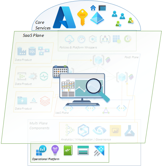 This drawing hopefully helps with our understanding and what I’ve been banging on about and how those planes of my delivered data mesh architecture fit. Of course, drawing them on the right-hand side doesn’t really work when I already have the PaaS and IaaS planes featured in the main stack. So, to improve accuracy this could be drawn like the below picture. To fully inform the intent of the SaaS plane (20% image transparency to save the day).